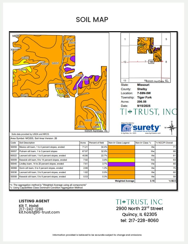The Buzzard farm real-estate offers productive tillable cropland, and recreational timber all in one tract. The property consists of 206.58 FSA cropland acres. It includes productive Mexico and Putnam soil types with a NCCPI overall score of 66.5. It is improved with a grain bin, and has Missouri Rural Electric and PWSD#1 of Shelby County water available.
